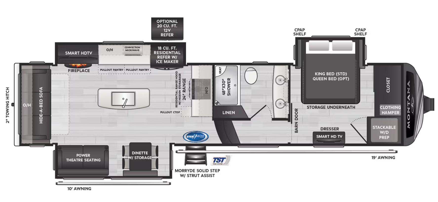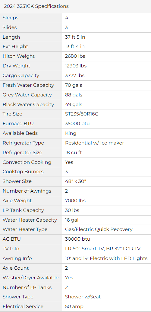 The Montana 3231CK has an awesome floorplan for its class and size. We chose this unit primarily because of the floorplan, as most people do - especially the larger bathroom with the large sized shower and dual vanities as well as the gorgeous and very functional kitchen.